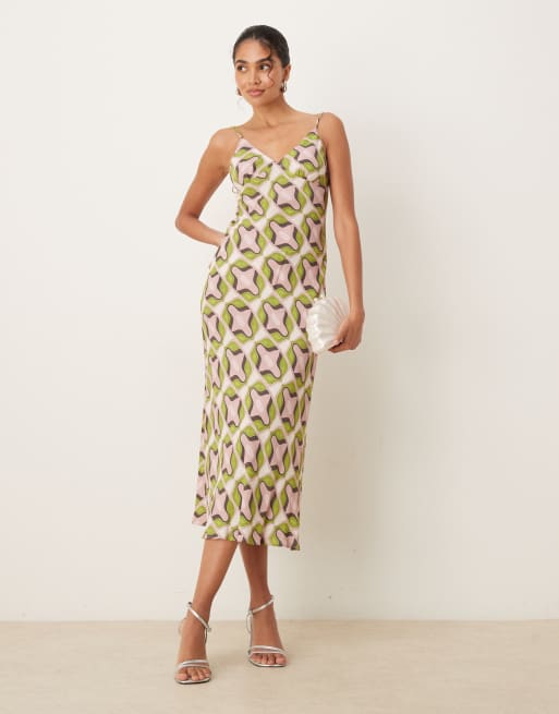 Mango – Pastellrosa, geometriskt mönstrad, rak maxiklänning med v-ringning i retrostil