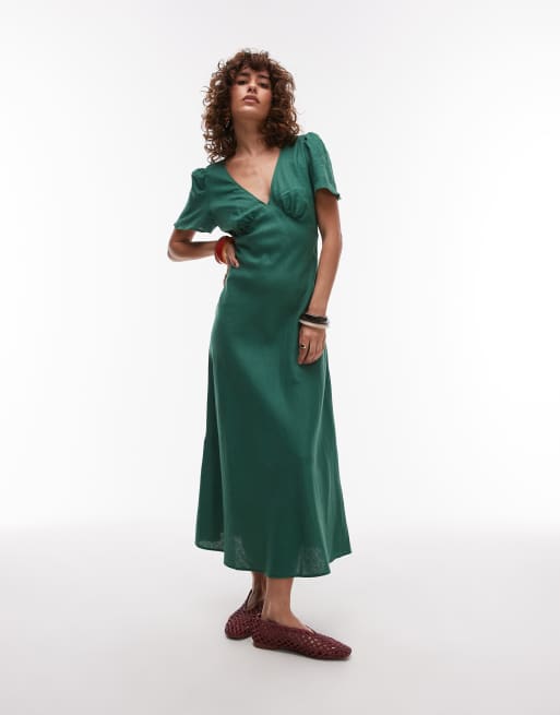 Mango – Smaragdgrön midiklänning i linnemix med korta ärmar