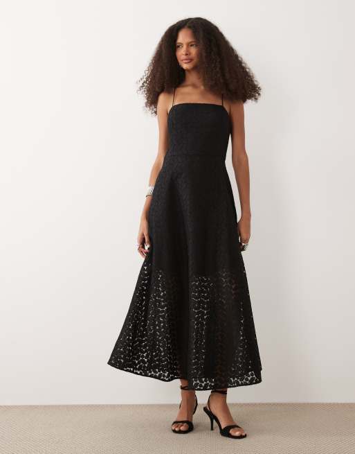 Mango – Svart, broderad maxiklänning med smala axelband