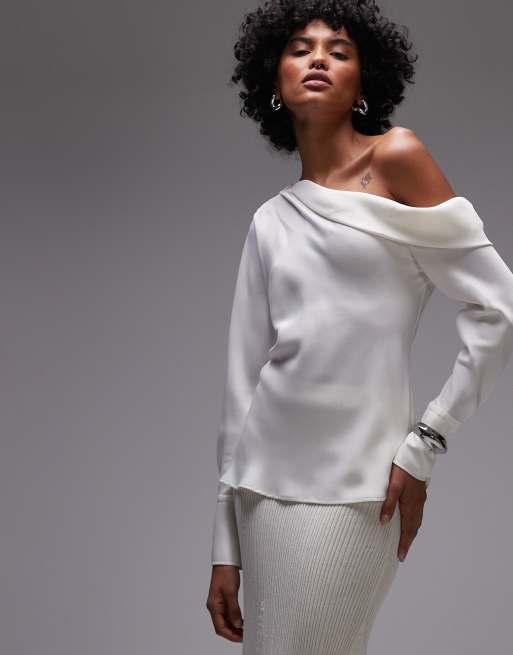 Mango – Vit enaxlad topp i satin med långa ärmar