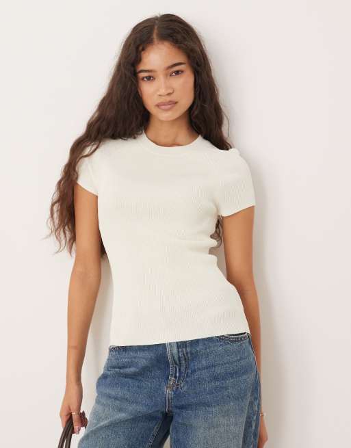 Mango – Vit, stickad topp med korta ärmar och rund krage