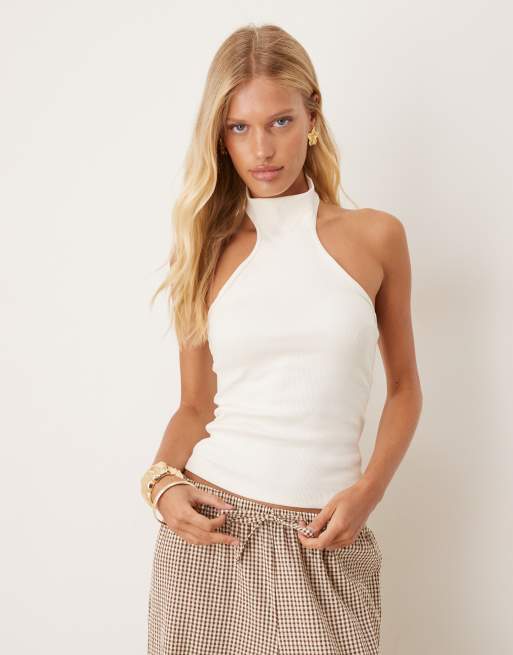 Mango – Vitt linne i bomull med halterneck och brottarringning