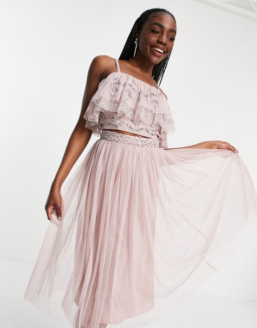 Maya Tall – Utsmyckat set med crop top i cold shoulder-design och midikjol med slits i tyll