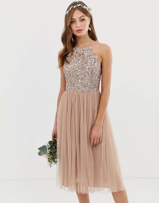Maya – Ljusrosa midiklänning i tyll med halterneck och paljetter som går ton-i-ton till brudtärnan