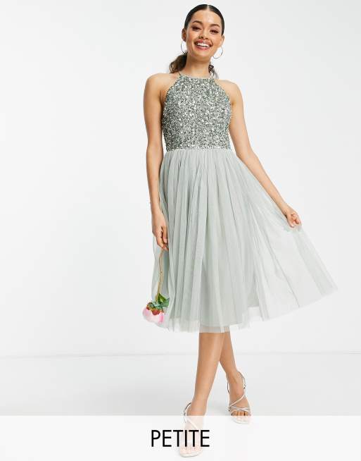 Maya Petite – Brudtärnor – Salviagrön midiklänning i tyll med halterneck och tunna, ton-i-ton-färgade paljetter