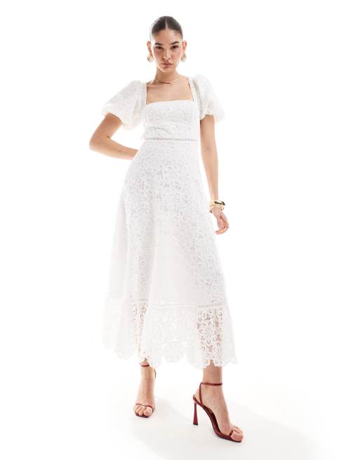 Maya – Vit midaxiklänning med detaljer och fyrkantig ringning i spets