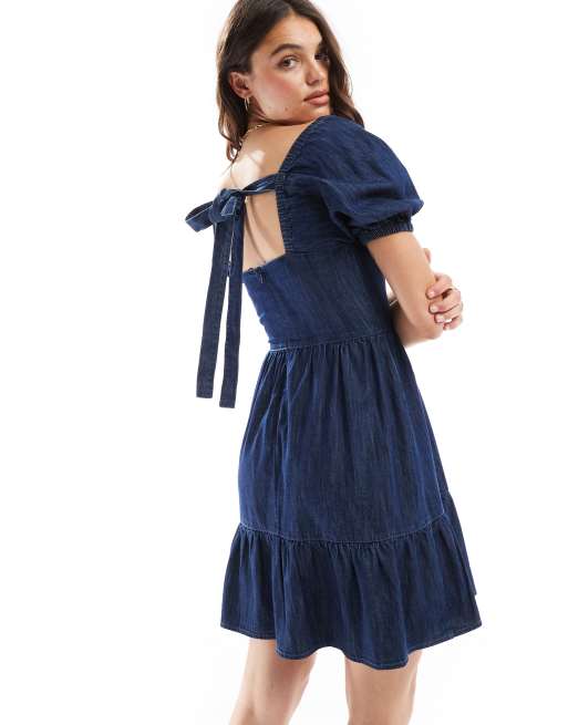 Miss Selfridge – Blå jeansklänning i minilängd med puffärmar