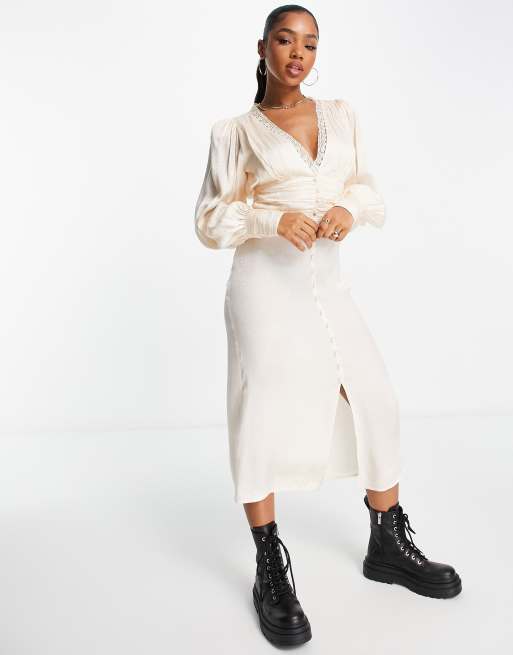 Miss Selfridge – Champagnefärgad maxiklänning med knäppning och spetsdetaljer av jacquardvävd satin