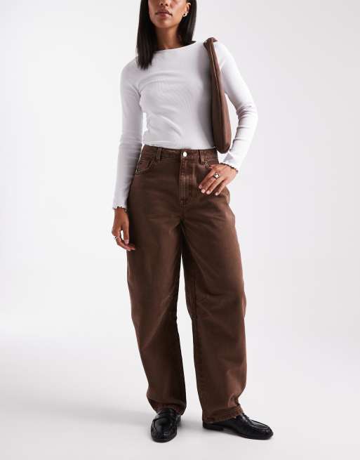 Miss Selfridge – Chokladbruna jeans med barrelben och tvättad finish