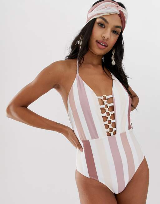 Miss Selfridge – Exclusive – Randig baddräkt med metalldetaljer