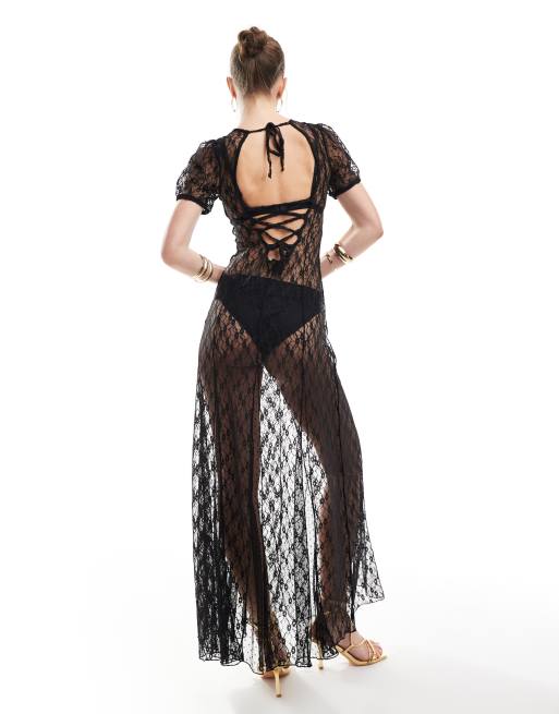 Miss Selfridge – Festival – Svart, skir maxiklänning med klockad kjol i spets