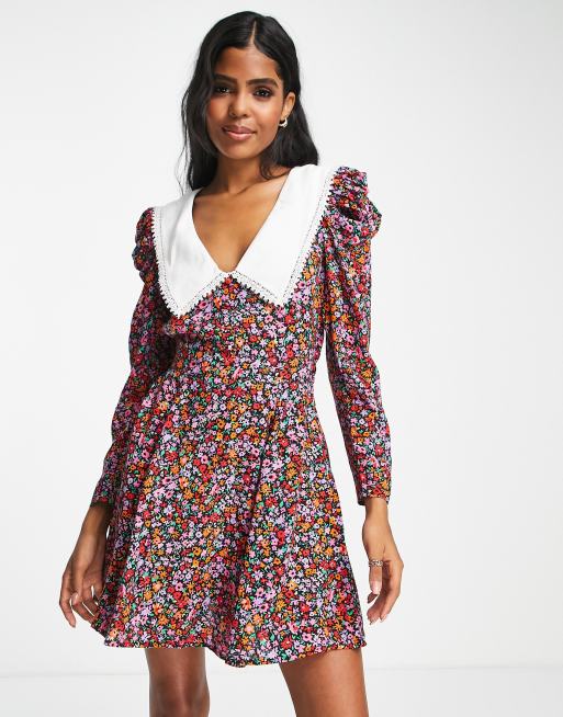 Miss Selfridge – Flerfärgad småblommig miniklänning med utskuren detalj krage