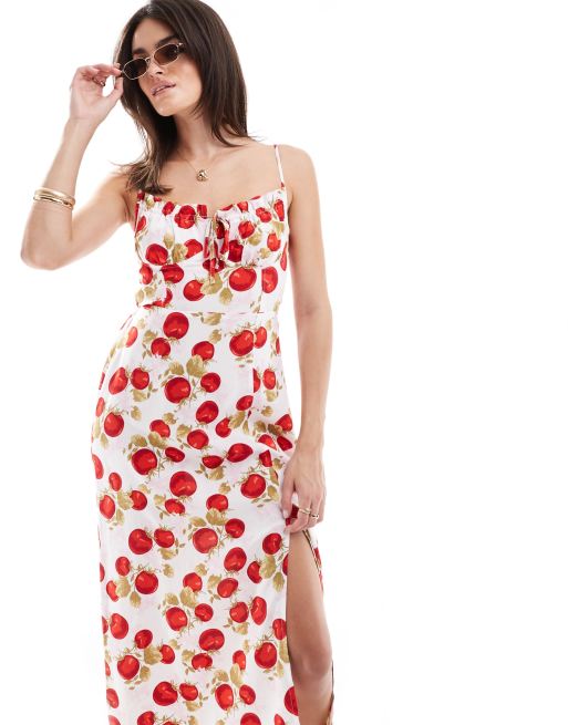 Miss Selfridge – Fruktmönstrad slipklänning i maxilängd med korsettdetalj och smala axelband