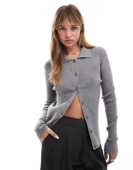 Miss Selfridge – Gråmelerad, ribbstickad kofta med figurnära passform