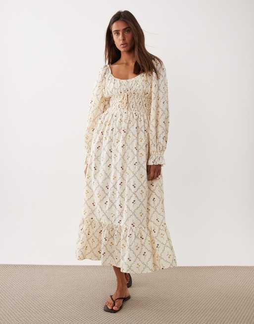 Miss Selfridge – Gul, småblommig maxiklänning i milkmaid-modell