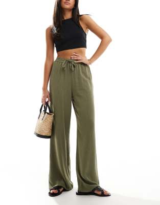 Miss Selfridge – Kakifärgade byxor i linnemix och dra på-stil med vida ben
