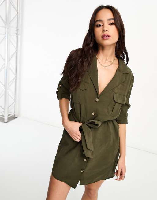 Miss Selfridge – Kakigrön skjortklänning i cargostil med skärp