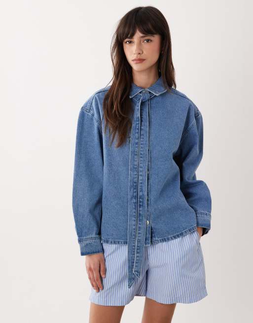 Miss Selfridge – Långärmad jeansskjorta med rosett