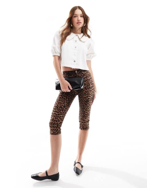 Miss Selfridge – Leopardmönstrad capri-shorts i denim