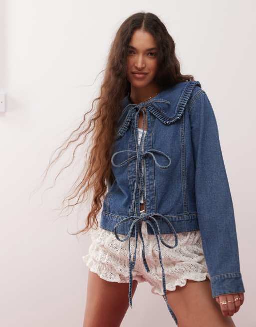 Miss Selfridge – Mellanblå, tvättad jeansjacka med volangkrage och knytband framtill