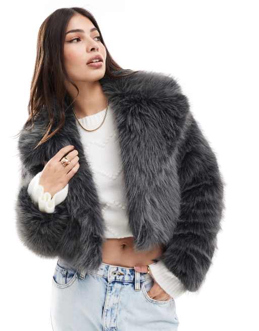 Miss Selfridge – Mörkgrå kort jacka i fuskpäls