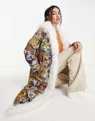 Miss Selfridge – Panelsytt mönstrad, lång puffekappa i mongolisk stil med fuskpälskrage