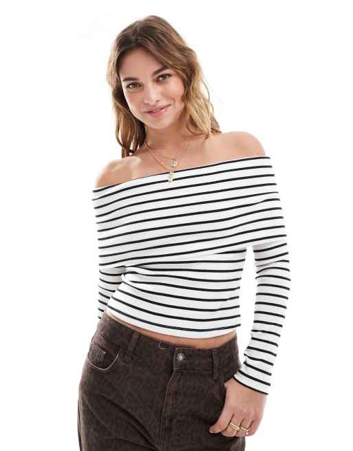 Miss Selfridge – Randig, ribbad topp med nedvikt bardotringning