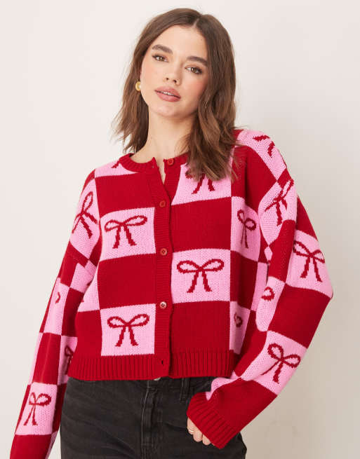 Miss Selfridge – Röd och rosa kofta med rosettmönster