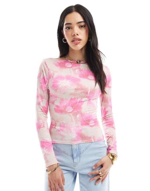 Miss Selfridge – Rosa jersey-topp med abstrakt blommönster