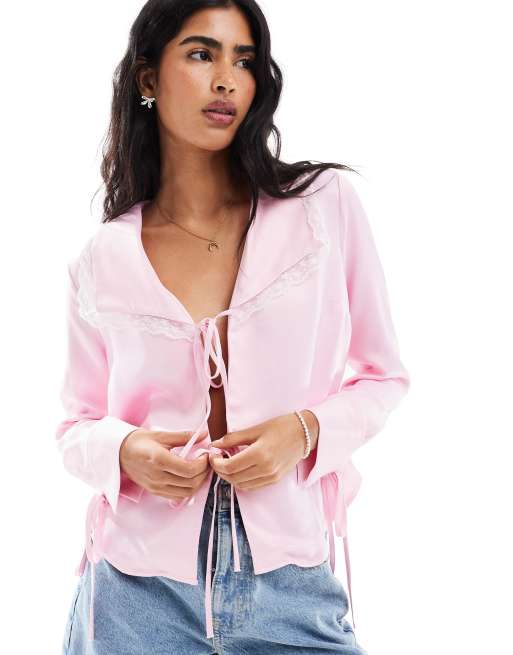 Miss Selfridge – Rosa skjorta med krage och knytning framtill av satin