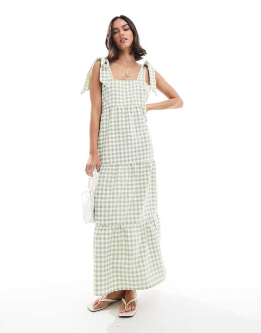 Miss Selfridge – Salviagrön, ginghamrutig, panelsydd maxiklänning med knytning på axlarna