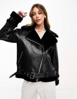 Miss Selfridge – Svart, lång pilotjacka i slitet konstläder med fuskpälsfoder