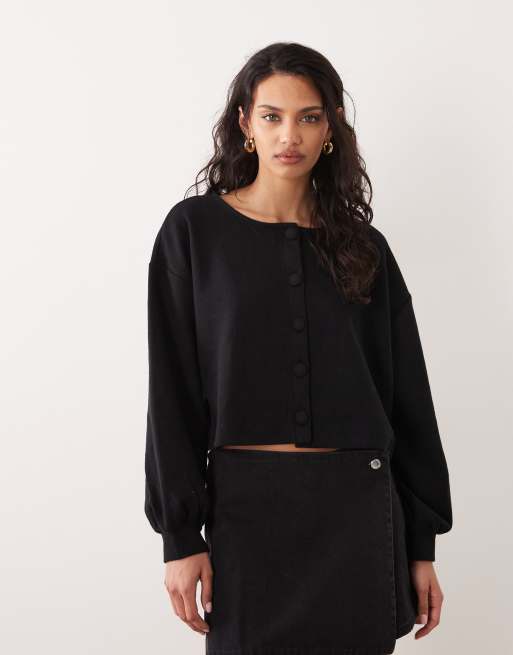 Miss Selfridge – Svart, ribbad, borstad kofta med ballongärmar