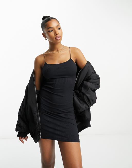 Miss Selfridge – Svart, smal och ribbad slipklänning med smala axelband
