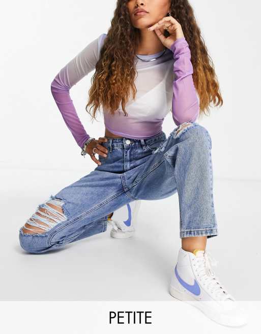 Missguided Petite – Riot – Blå mom jeans med slitningar