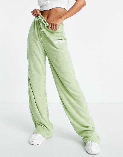 Missguided Tall – Set i frotté med mjukisbyxor med vida ben och crop top med Happiness-text