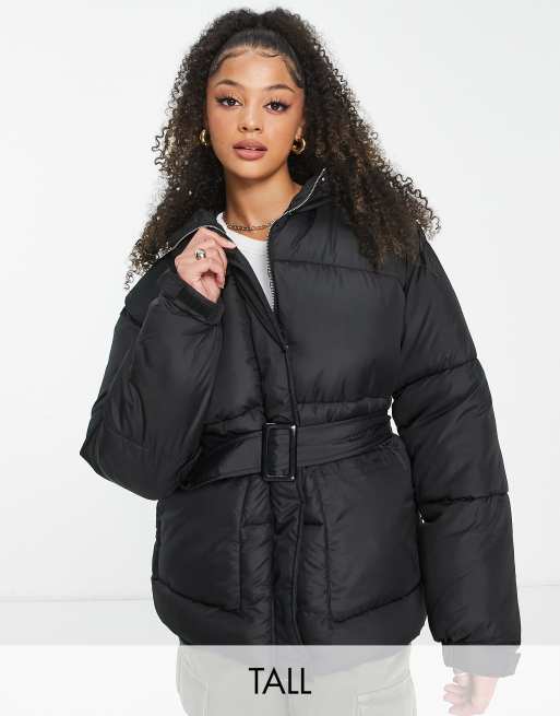 Missguided Tall – Svart pufferjacka med huva och skärp