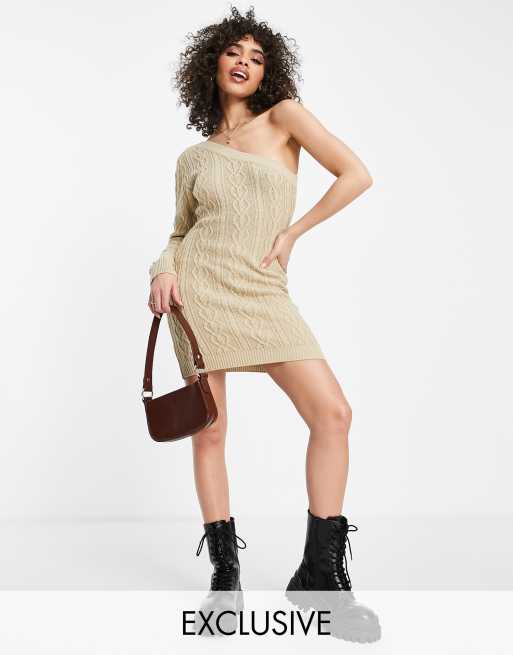 Missguided – Sandfärgad kabelstickad klänning med enaxlad design
