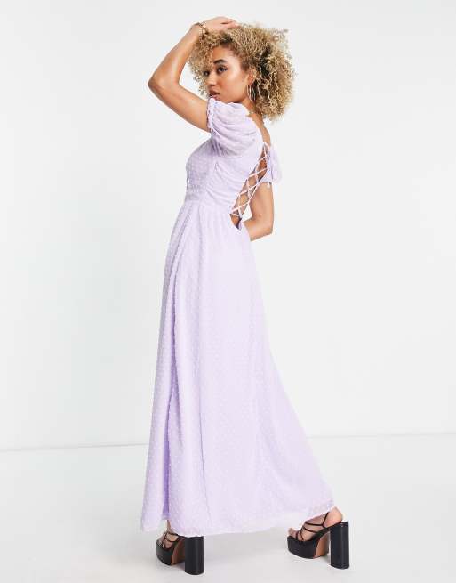 Missguided – Syrénlila, dobbyvävd milkmaid-klänning i midaxilängd med snörning baktill