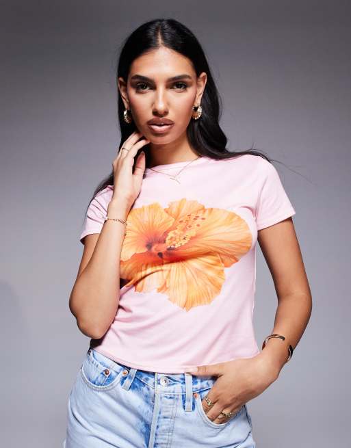 Missy Empire – Ljusrosa t-shirt i kort modell med orange hibiskus-blomtryck