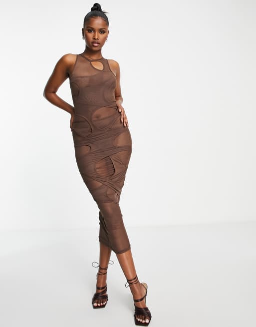 Missy Empire x Aaliyah Ceilia – Chokladbrun maxiklänning med överlager med utskurna detaljer av mesh