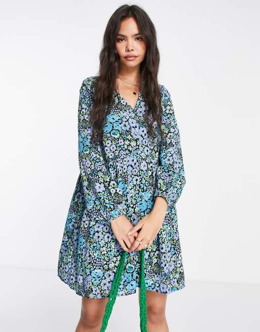 Monki – Blå blommig klänning med långa ärmar