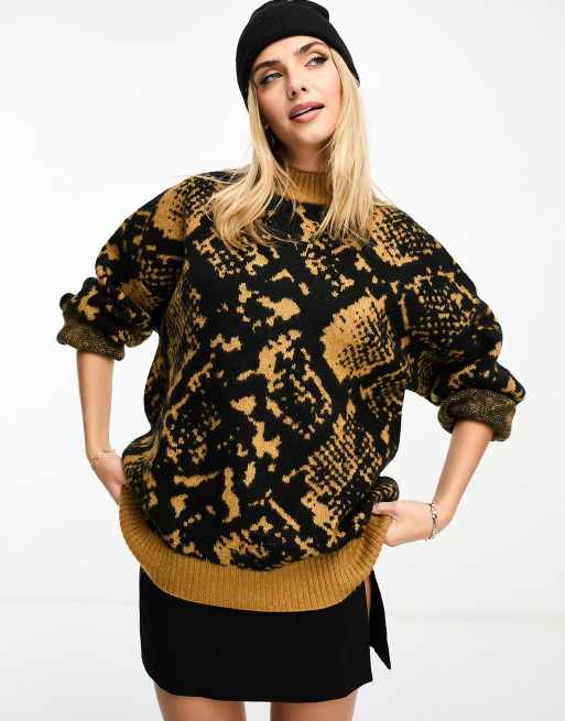 Monki – Brun, stickad tröja i jacquard med ormskinnsmönster