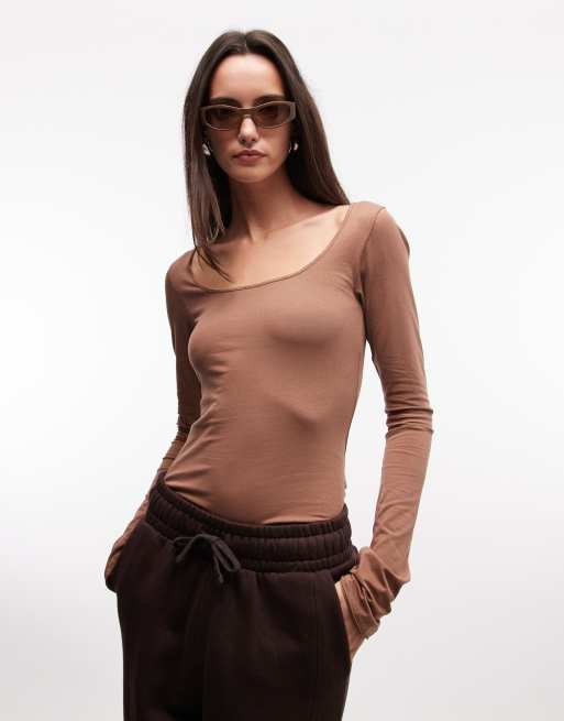 Monki – Brun t-shirt med djup halsringning, långa ärmar och smal passform