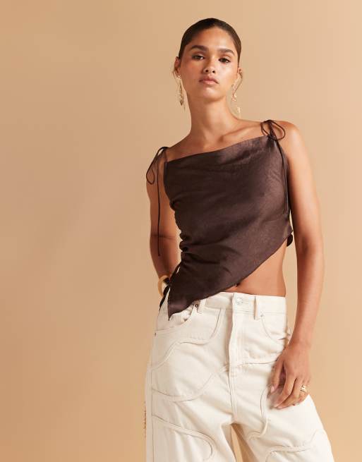 Monki – Brunt linne i satin med draperad ringning och rynkad knytdetalj i sidan
