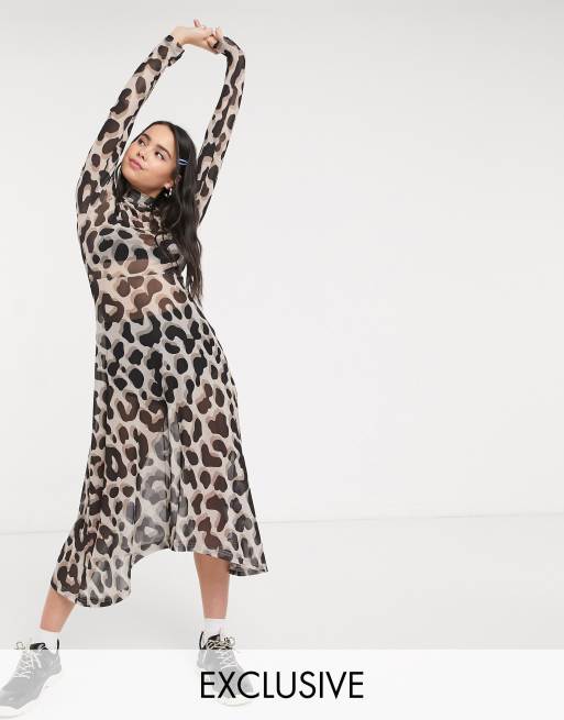 Monki – Cecilia – Leopardmönstrad midiklänning i mesh med hög krage