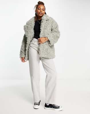 Monki – Grå jacka i lockig fuskpäls