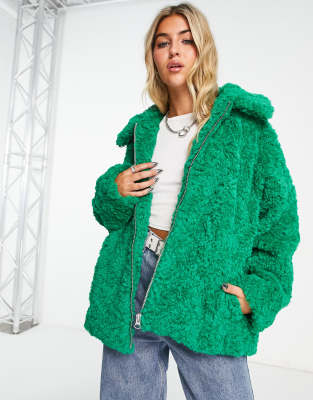 Monki – Grön jacka i lockig fuskpäls med boxig passform