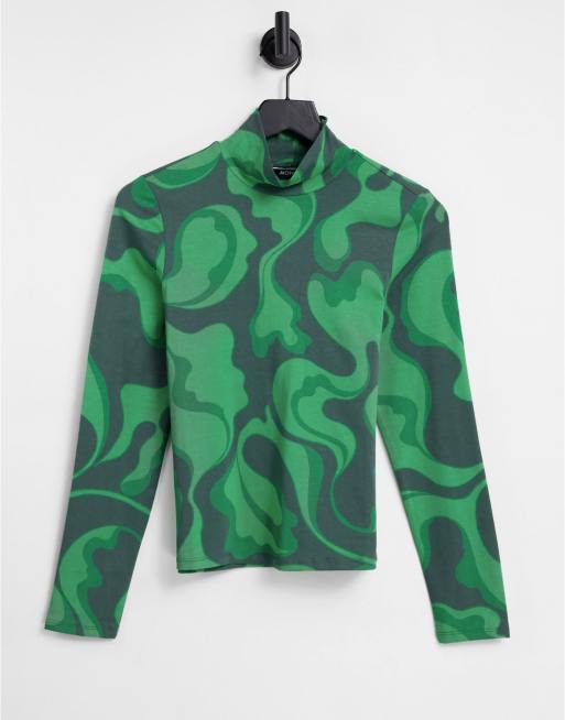 Monki – Grön, virvelmönstrad topp i bomull med hög ringning - MGREEN