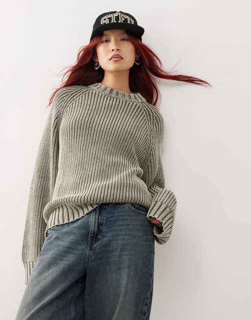 Monki – Kakifärgad, bredribbad tröja med rund halsringning och stentvätt